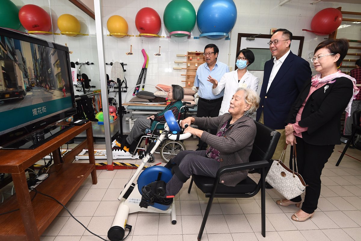 楊偉雄(右二)探訪佛教李嘉誠護理安老院,觀看長者利用互動腳踏單車進行復健訓練。