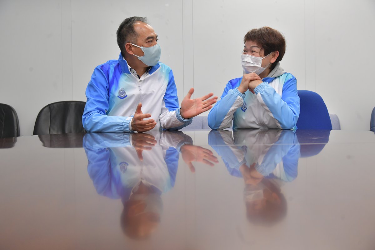 警察抗疫專隊由警察學院院長張靜(左)擔任隊長,警務處退休副處長黃志雄亦有參加義務工作。