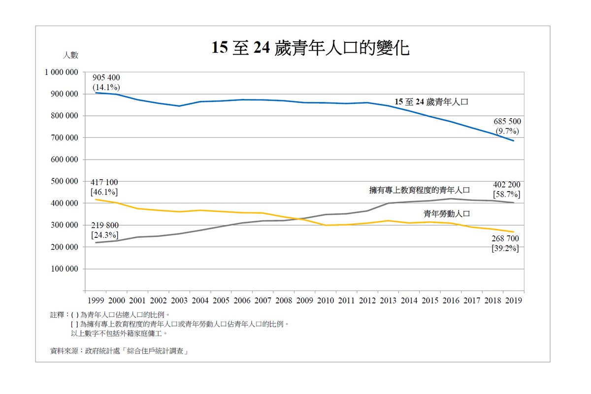 1999至2019年期間,本港15至24歲青年人口減少了219,900人,平均每年下降1.4%。2019年青年人口有685,500人,佔總人口僅9.7%,遠低於1999年的14.1%。