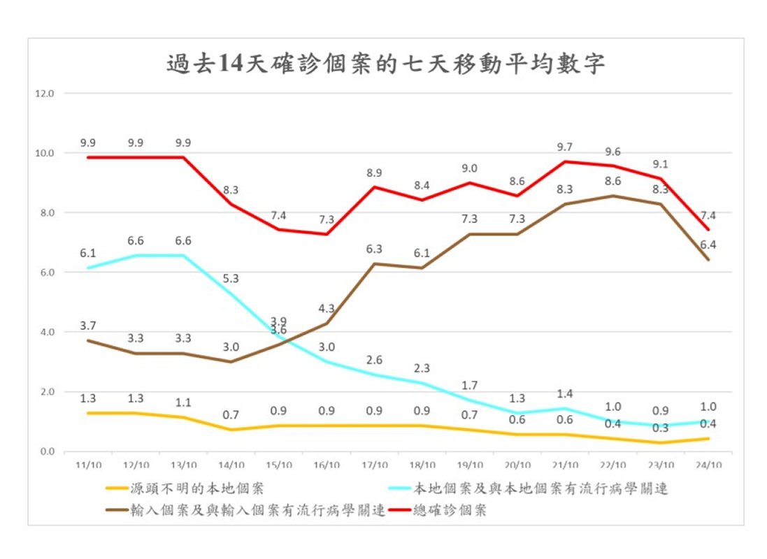 過去一個月每日確診個案在個位數至低雙位數之間徘徊,由9月25日至10月24日,共錄得233宗個案,但超過六成是輸入個案,都是通過抵港後的「test and hold」檢測找出或在14天強制檢疫期間確診,並無進入社區。至於本地確診個案,曾出現連續十天(9月30日至10月9日)有源頭不明的個案,涉及泰裔人士、殘疾人士院舍、酒店及酒吧的群組。我們極度關注疫情反彈,採取了具針對性的措施應對。在過去兩星期(10月11日至10月24日),雖然其中有七天沒有任何源頭不明的本地個案,但反映社區仍有未切斷傳播鏈的不明源頭個案一宗都嫌多,加上進入秋冬季節,病毒可能變得活躍,社會必須保持警覺。