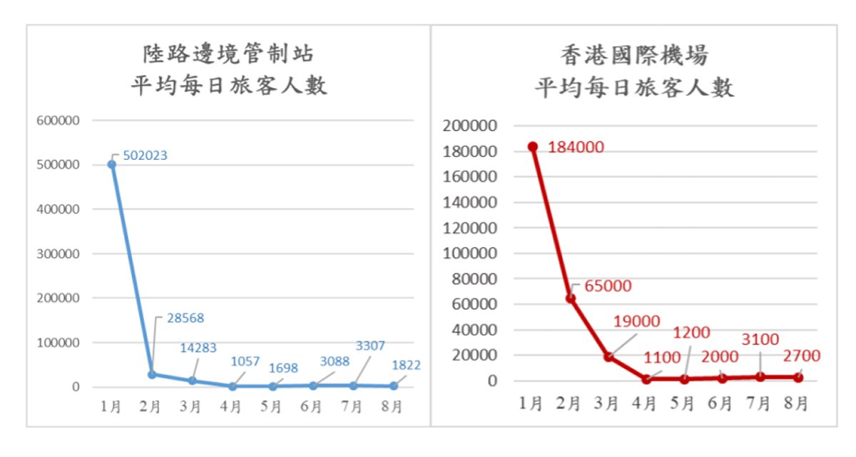 持續九個月的疫情,令全球經濟萎縮,香港的大部分行業都受到重挫,只要看看以上的陸路和航空旅客數目的下挫,就知道疫情對航空、旅遊和相關行業的打擊。