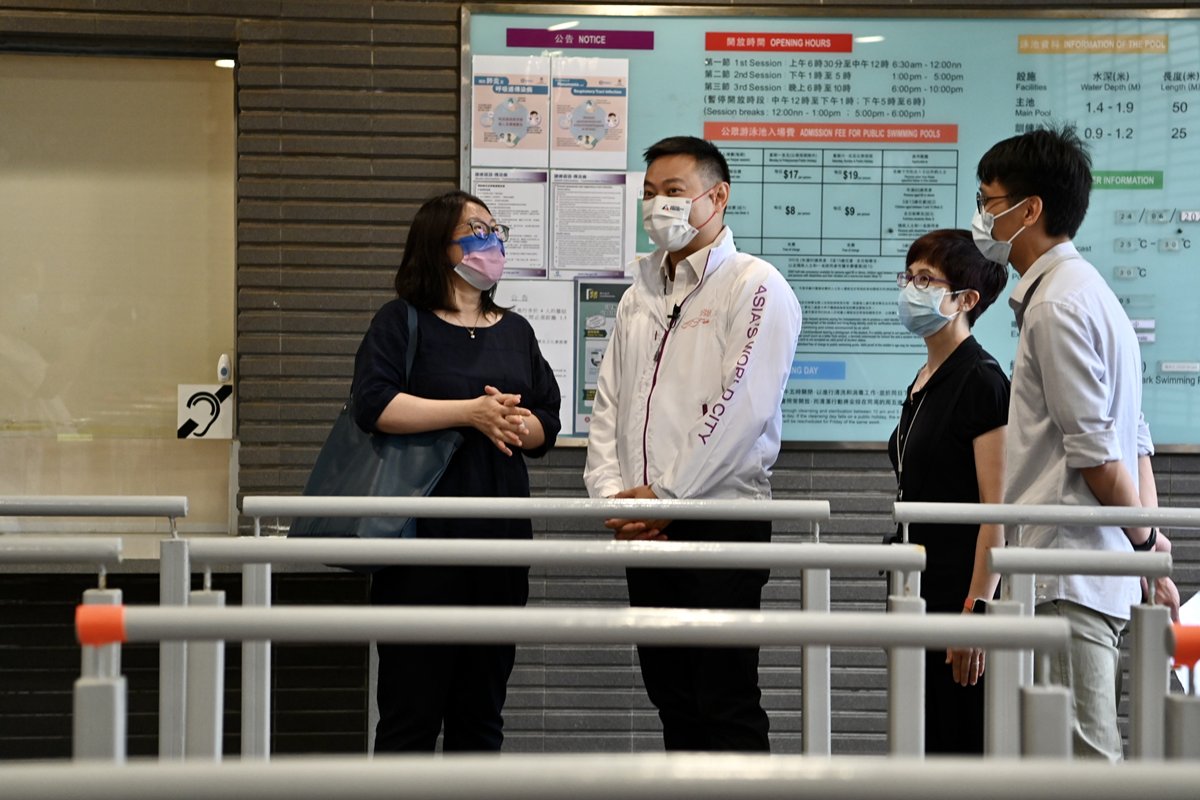徐英偉視察康樂及文化事務署在該游泳池採取的特別措施,並與場地職員交談,了解其工作情況和流程。