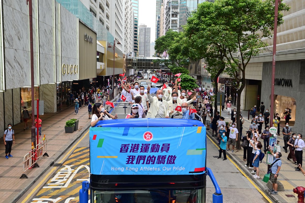 特區政府與中國香港體育協會暨奧林匹克委員會今日為出戰東京2020奧林匹克運動會中國香港代表團在佐敦、尖沙咀一帶舉行巴士巡遊,並在西九文化區戲曲中心舉行返港歡迎儀式,祝賀他們凱旋而歸。