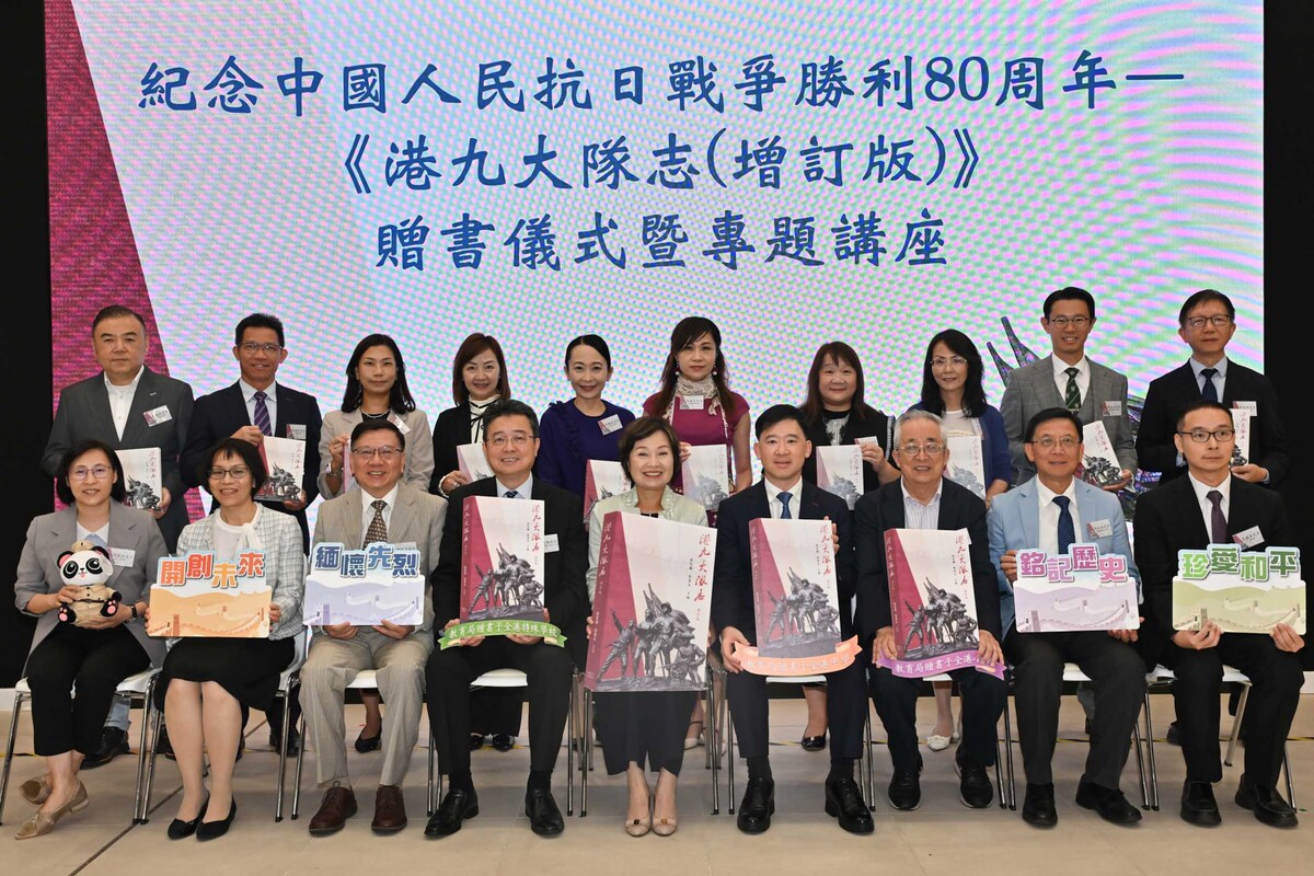 教育局今日舉行紀念中國人民抗日戰爭勝利80周年---《港九大隊志(增訂版)》贈書儀式暨專題講座,局長蔡若蓮將《港九大隊志(增訂版)》贈予學校議會及校長會代表,以豐富教授抗日戰爭的相關內容,提升學與教成效。