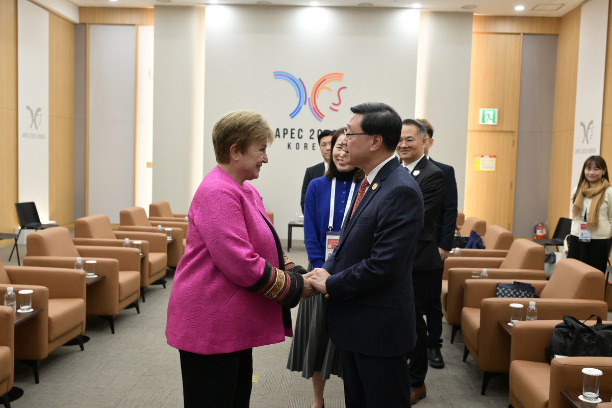 行政長官李家超今日繼續韓國訪問行程,出席亞太區經濟合作組織相關活動,並分別與新加坡、阿拉伯聯合酋長國和國際貨幣基金組織領袖會面。