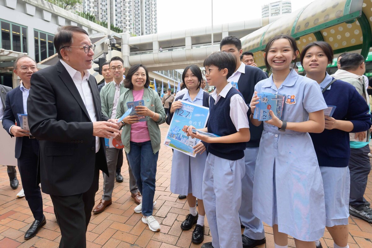 陳國基、曾國衞和麥美娟向市民派發宣傳單張和吉祥物票箱家族紀念品,並與在場市民交談,呼籲他們下月7日投票日預留時間投票。