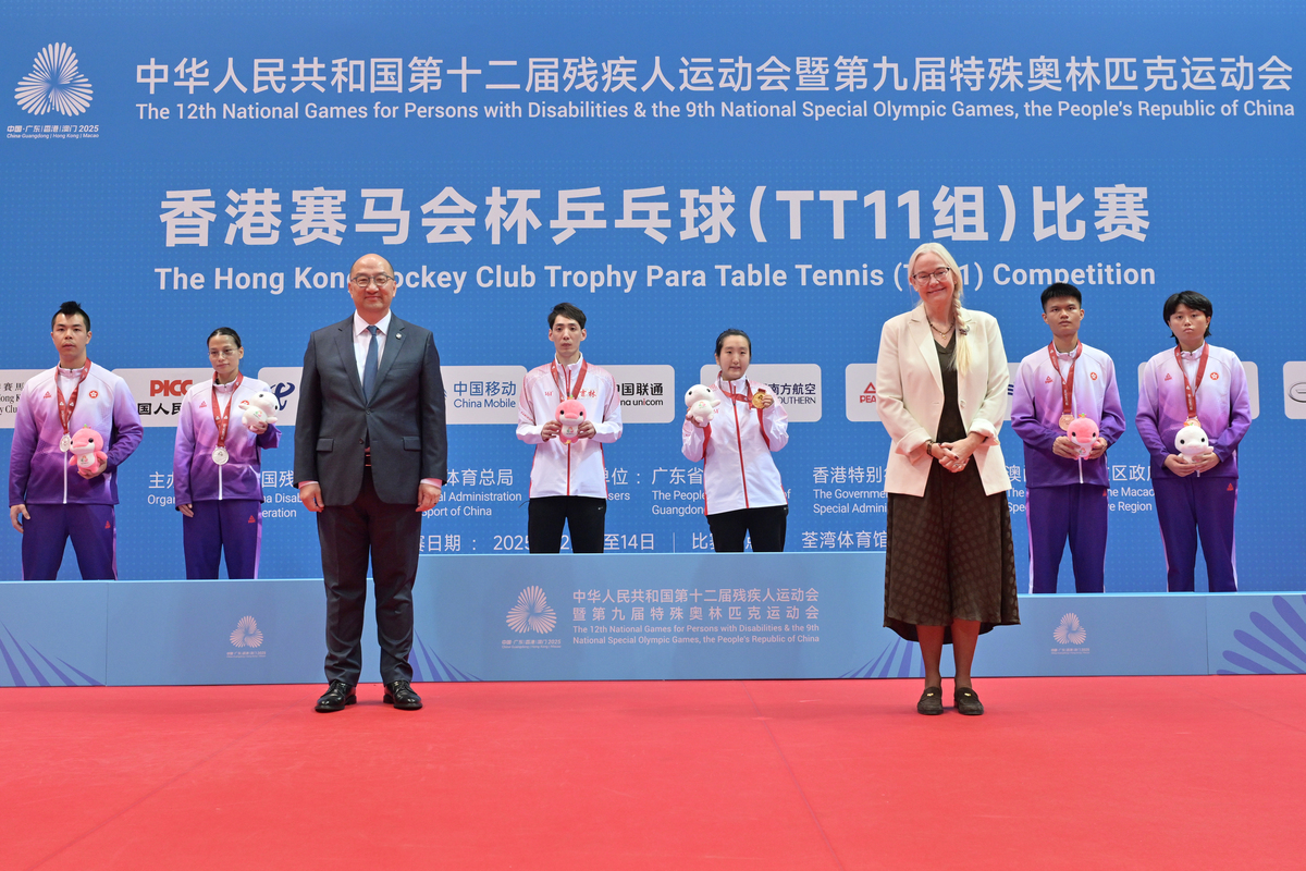 港隊的溫偉樂(左一)、黃珮淇(左二)奪乒乓球(TT11組)比賽混合雙打銀牌,同為港隊的袁景誠(右二)、王婷莛(右一)獲銅牌。金牌得主為吉林隊王博(左四)、唐亦欣(右四)。