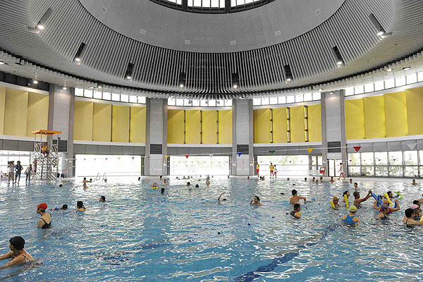 It has a 25m by 25m indoor training pool, an indoor leisure pool, a 50m by 25m standard main pool, a 25m by 15m training pool, and a 25m by 12m teaching pool. The main pool is suitable for swimming competitions and has an 800-seat spectator stand.