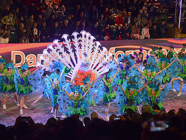 The overseas performances included stilt walkers, cheerleaders and folk dances.