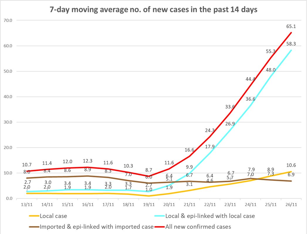 Before mid-November, the daily number of confirmed cases hovered between single and low double digits, with the majority being imported cases. Yet, sporadic local cases with unknown sources of infections still emerged from time to time, indicating that there were still silent transmissions in the community. Over the past week, the epidemic situation has worsened rapidly. A total of 456 cases were reported in the past seven days, from November 20 to 26, with 408 of them being local cases. The situation is worrying.