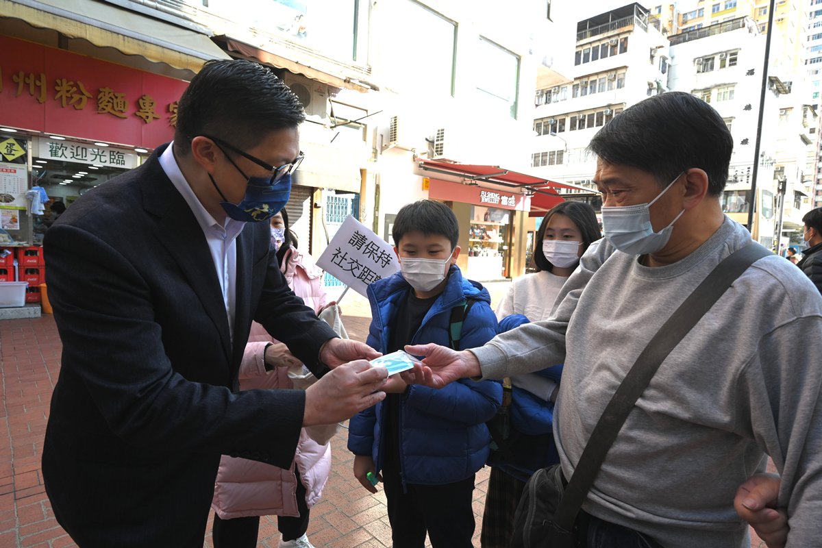 Secretary for Security Tang Ping-keung (left) gives out COVID-19 rapid test kits to citizens in Yuen Long.