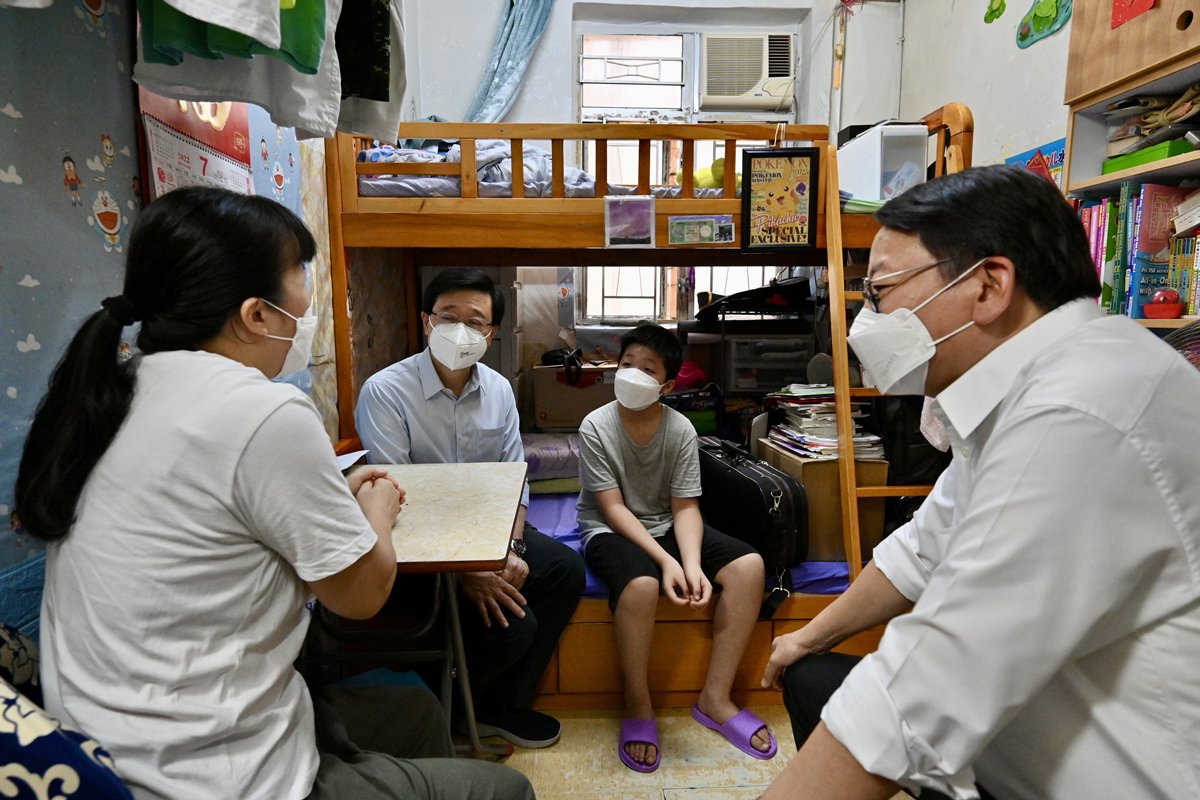 Accompanied by Chief Secretary Chan Kwok-ki and Secretary for Home & Youth Affairs Alice Mak, Mr Lee inspected a three-nil building and paid a visit to a grassroots family living in a subdivided flat there, during which he learnt more about the family's living condition and their perspective on poverty alleviation measures.