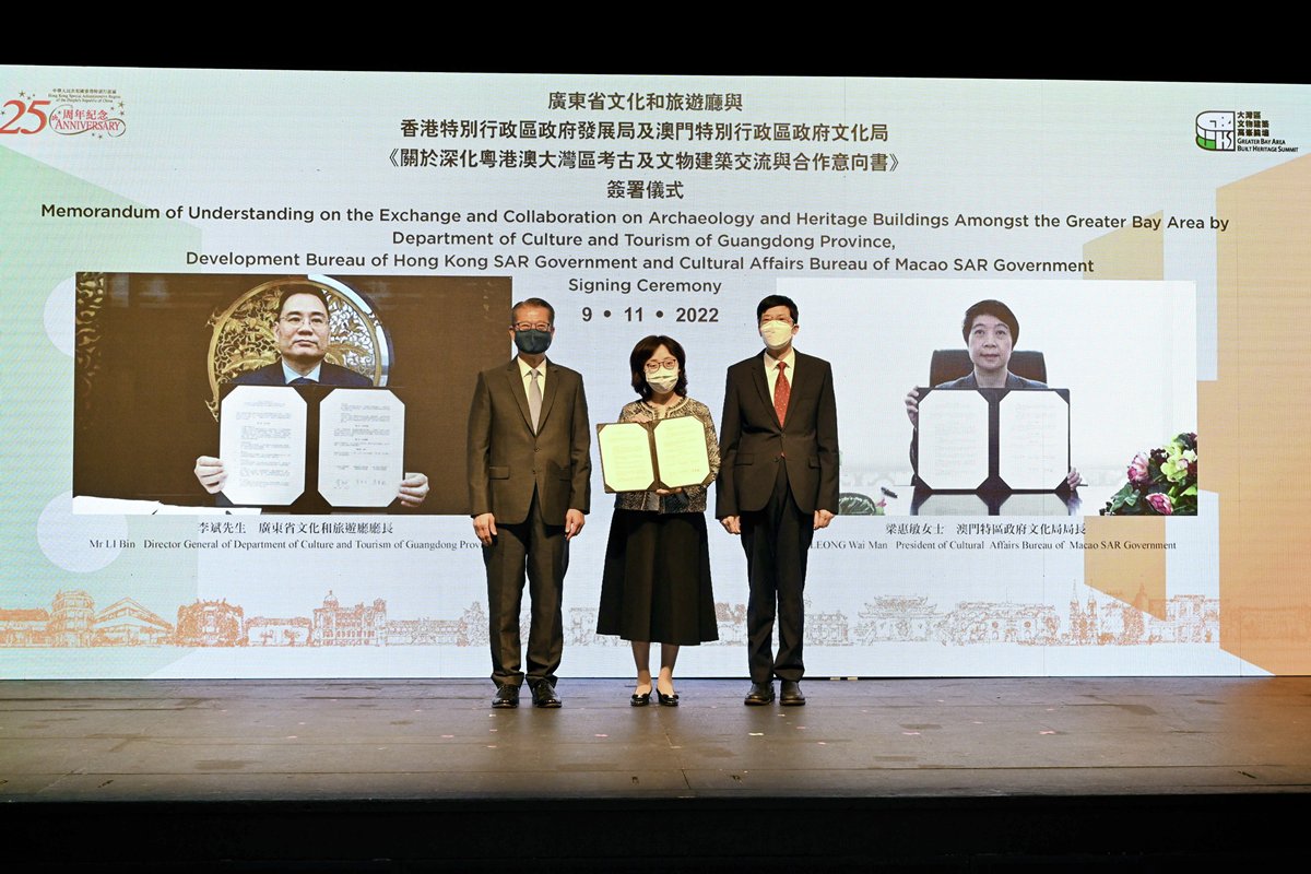 Witnessed by Financial Secretary Paul Chan (left), Secretary for Development Bernadette Linn (centre) and representatives from the Guangdong Department of Culture & Tourism and the Macao Special Administrative Region’s Cultural Affairs Bureau sign the MOU on the Collaboration & Exchange on Cultural & Archaeological Heritage amongst the Greater Bay Area.