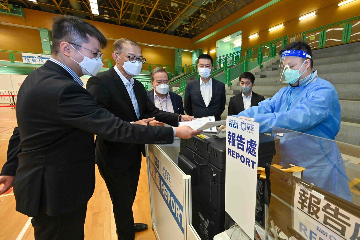 Secretary for Health Prof Lo Chung-mau observes the location for collecting test result reports for self-paid testing at the community testing centre.