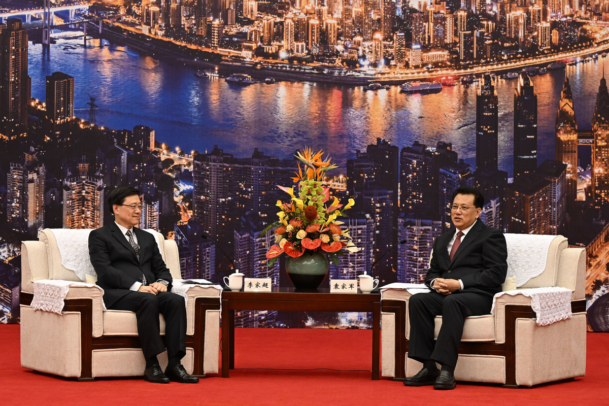 Chief Executive John Lee continued his visit to Chongqing today by meeting CPC Chongqing Municipal Committee Secretary Yuan Jiajun and attending the High-Level Meeting & First Plenary Session of the Hong Kong/Chongqing Co-operation Conference.