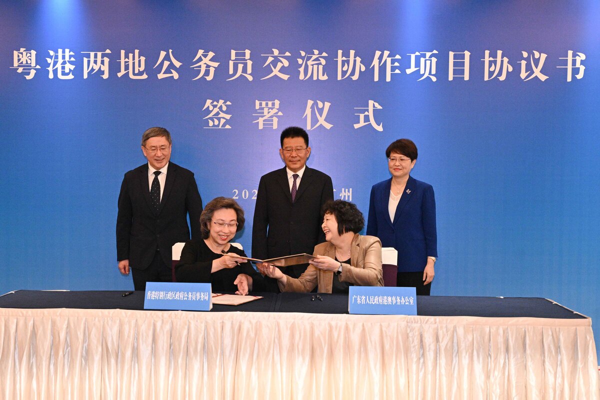 Witnessed by Mr Wang, Ms Feng and Mr Cheuk, Secretary for the Civil Service Ingrid Yeung and Guangdong HKMAO Director General Li Huanchun signed the Agreement on Civil Service Staff Exchange & Collaboration Programme with the Mainland Municipalities in the Guangdong-Hong Kong-Macao Greater Bay Area to deepen exchanges between civil servants of both places in different fields and support the high-quality development of the GBA.