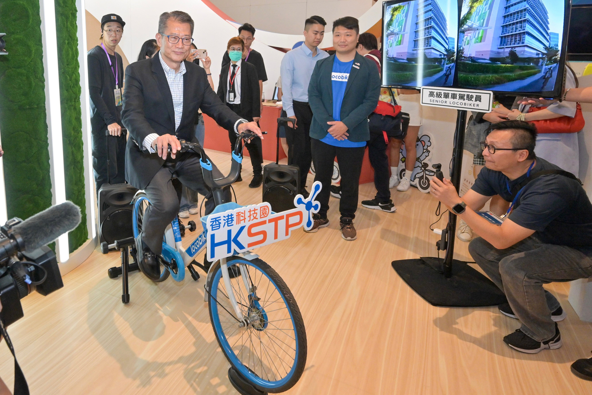 Financial Secretary Paul Chan (left) rides a bicycle that forms part of the display at the Science & Technology Parks Corporation’s booth at InnoCarnival 2023.