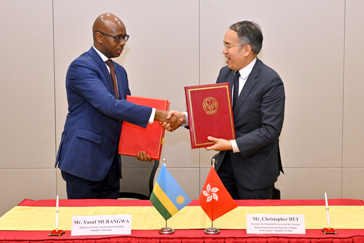 Secretary for Financial Services & the Treasury Christopher Hui held a bilateral meeting in Hong Kong today with Rwanda’s Minister of Finance & Economic Planning Yusuf Murangwa, and signed on behalf of the Hong Kong Special Administrative Region Government a comprehensive avoidance of double taxation agreement (CDTA) with the Rwandan government.