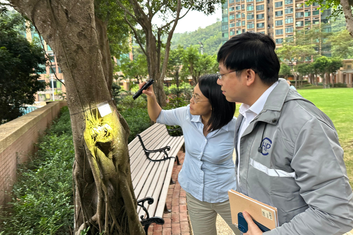 CHP Communicable Disease Branch Head Dr Albert Au (right) and FEHD Pest Control Officer-in-charge Anita Fok conduct an on-site inspection to carry out vector surveys.
