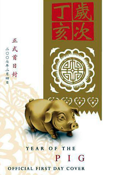 這套共4款的郵票,以中國傳統剪紙工藝作為背景,加強新春氣氛;也會發行1套嵌有兩枚生肖郵票的「十二生肖金銀郵票小型張 --- 靈犬寶豬」。還有1套4枚以猴、雞、狗、豬為題的絨面生肖郵票發售。