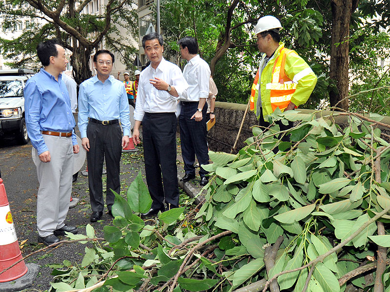 他接着前往半山麥當勞道,該處有不少樹木被強風吹倒,樹木辦公室和路政署人員迅速在現場連夜清理,人流和交通都沒有受到影響。他叮囑工作人員要做好善後和檢查工作,確保市民的安全。