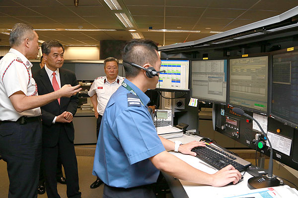 梁振英在消防處處長陳楚鑫陪同下,參觀消防通訊中心,聽取當值人員講解如何調派滅火和救護資源,和接受公眾有關火警危險及危險品的投訴。