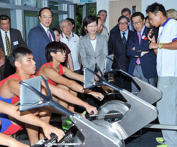 政務司司長林鄭月娥(前排右四)參觀賽艇中心的訓練設施。