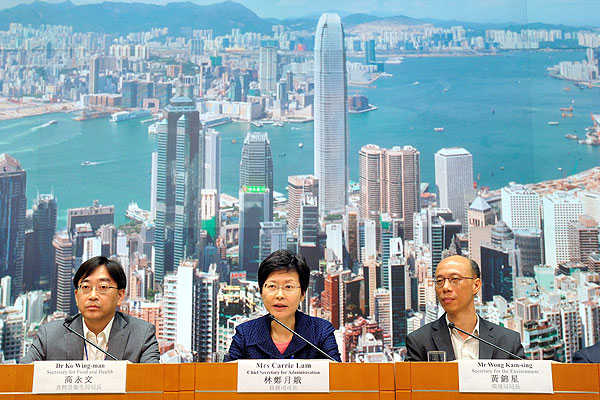 匯報情況: 政務司司長林鄭月娥(中)、食物及衞生局局長高永文(左)和環境局局長黃錦星,就颱風期間有聚丙烯塑膠原料散落海面和岸上的情況會見傳媒。