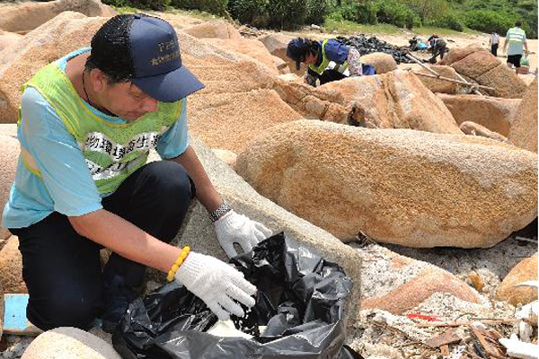 清理: 政府加派人手清理颱風韋森特吹襲後散落在海灘、海上及養魚區的聚丙烯塑膠粒。