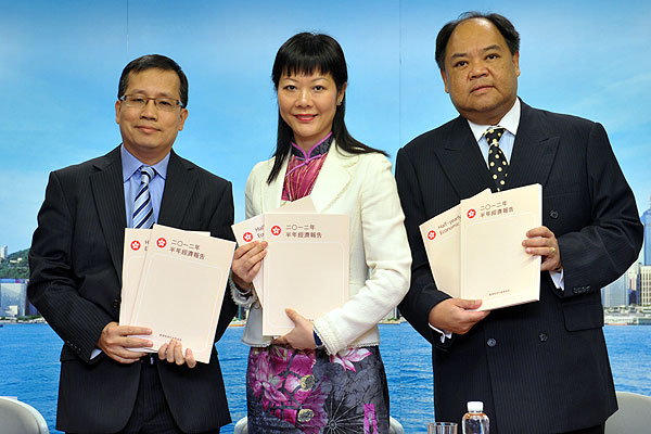 低增長: 政府經濟顧問陳李藹倫(中)公布,第二季實質本地生產總值升1.1%。