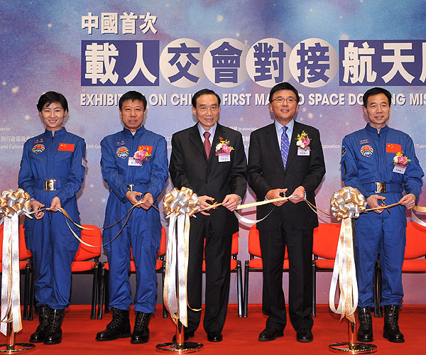 天宮一號與神舟九號載人交會對接任務代表團團長牛紅光、航天員景海鵬、劉旺和劉洋與署理財政司司長陳家強今天(8月12日)在科學館為「中國首次載人交會對接航天展」主持揭幕儀式。