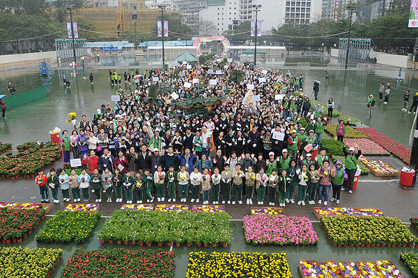 逾800名來自29間學校的學生,今天(3月3日)在維多利亞公園協助鑲嵌大型花壇「熱帶風情」,花壇在3月16日至25日舉行的香港花卉展覽中展出。