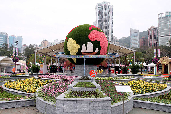 康文署的大型展品「花花世界」由超過16,000株花卉鑲嵌而成,中央的球體代表地球,環繞地球行走的傳統中式木帆船象徵香港,球體下方有一個顯示高樓大廈剪影的水景,球體周圍栽種了數千株風信子。