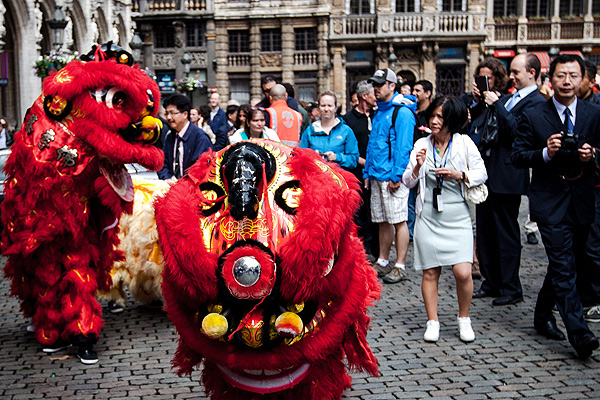醒獅誌慶: 醒獅帶領出席儀式的嘉賓、布魯塞爾市民和遊客參觀換上中山裝的撒尿小童銅像。