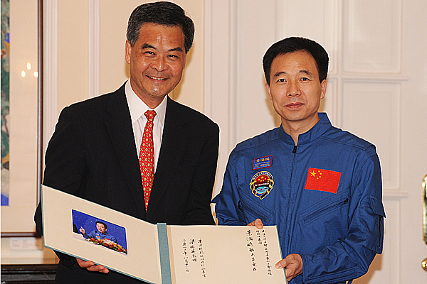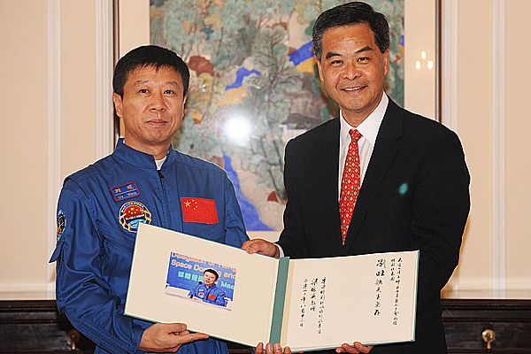 紀念: 行政長官梁振英(左)致送紀念品予航天員景海鵬。