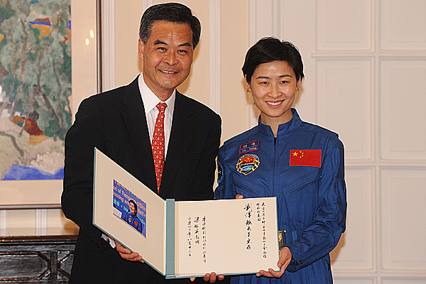 紀念: 行政長官梁振英(左)致送紀念品予航天員劉洋。