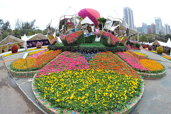 康樂及文化事務署的大型展品春日萬花筒 --- 動感之都,設計為一朵七彩繽紛的巨型花卉,寓意香港是閃耀的東方之珠,整個花壇主體由五萬株花卉組成。花冠以鏡面將花萼的花像萬花筒般反映,而中心的花蕊部分與花冠,各以順時針和逆時針方向轉動。