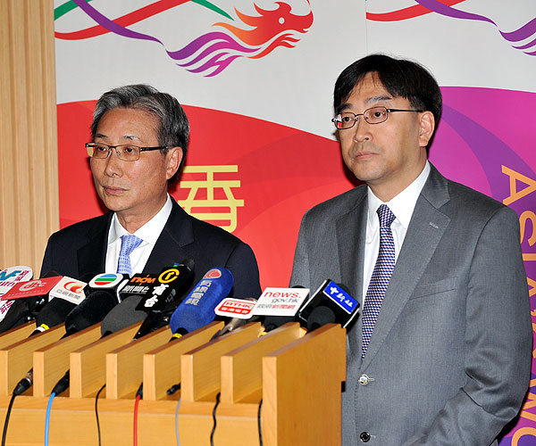 理想人選: 食物及衞生局局長高永文(右)歡迎梁智仁獲委任為醫管局新主席,指梁智仁是出任該職的理想人選。