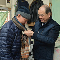 張建宗(右)探訪土瓜灣一名獨居長者,送上禦寒衣物。