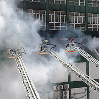 四樓方面,左邊的間隔仍然冒煙和高溫,右邊的情況已改善,目前派出四隊煙帽隊,出動兩條喉、一枝座地中攻喉筆、兩枝鋼梯水塔滅火,並已開始拆除左面的鋼板和大型玻璃以便通風。