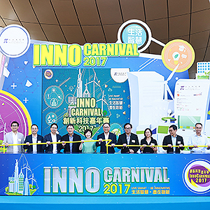 楊偉雄(右三)上周六在香港科學園主持創新科技嘉年華2017開幕典禮。